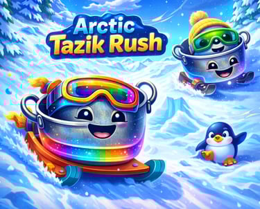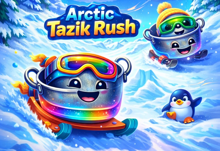 Race down snowy hills on a sled with tazik, dodging obstacles, jumping ramps, collecting crystals, and customizing gear with fun hats and goggles.